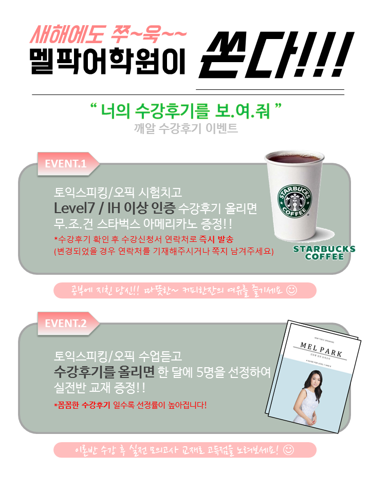 이벤트 | 수강후기 아메리카노 증정 이벤트!!! 페이지 정보 작성자 MELPARK 작성일16-02-11 15:21 조회3,456회 댓글0건 이전글 다음글 검색 목록 본문 댓글목록 등록된 댓글이 없습니다. 이전글 다음글 검색 목록