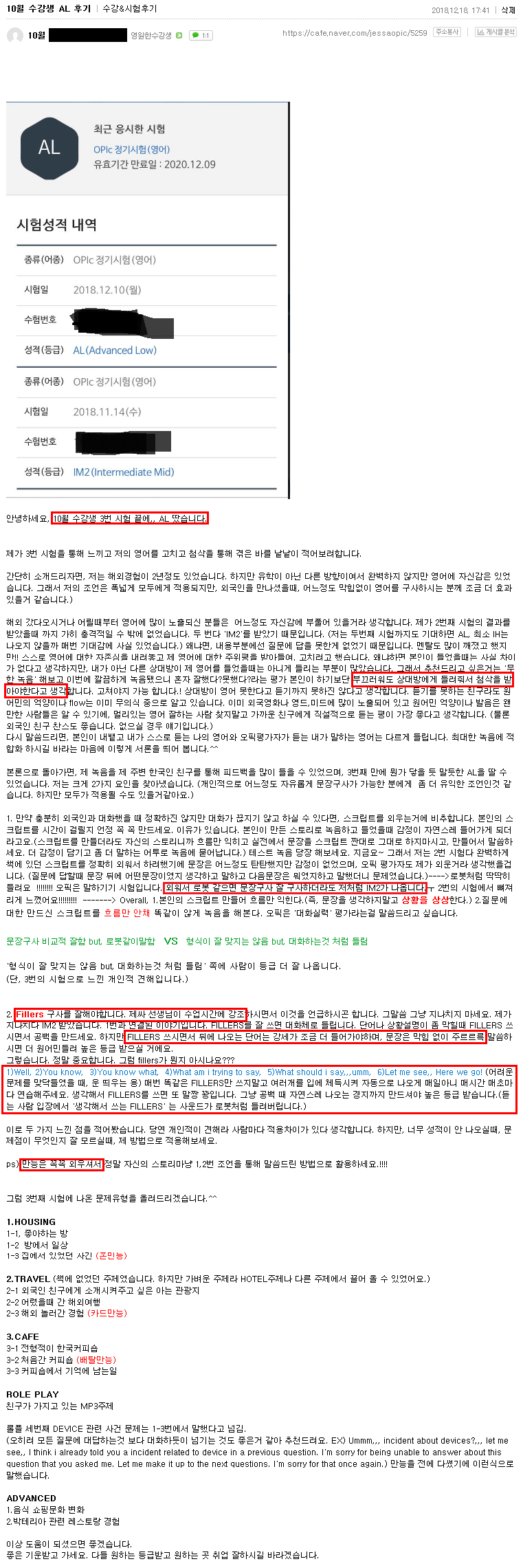 2. Fillers 구사를 잘해야합니다. 제싸 선생님이 수업시간에 강조하시면서 이것을 언급하시곤 합니다. 그말씀 그냥 지나치지 마세요. 제가 지나치다 IM2 받았습니다. 1번과 연결된 이야기입니다. FILLERS를 잘 쓰면 대화체로 들립니다. 단어나 상황설명이 좀 막힐때 FILLERS 쓰시면서 공백을 만드세요. 하지만 FILLERS 쓰시면서 뒤에 나오는 단어는 강세가 조금 더 들어가야하며, 문장은 막힘 없이 주르르륵 말씀하시면 더 원어민들려 높은 등급 받으실 거에요.