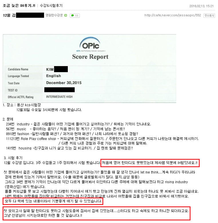 오픽 | (대구오픽 IH후기) 처음에 영어 하나도 못했는데..선생님 덕분에 IH 획득!! 페이지 정보 작성자 MELPARK 작성일16-02-17 11:22 조회4,060회 댓글0건 이전글 다음글 목록 본문 (클릭 하시면 크게 보실 수 있습니다.) 수강생 후기 입니다. 더 많은 후기는 우측 카페 링크 가입 후 보실 수 있습니다. 이전글 다음글 목록
