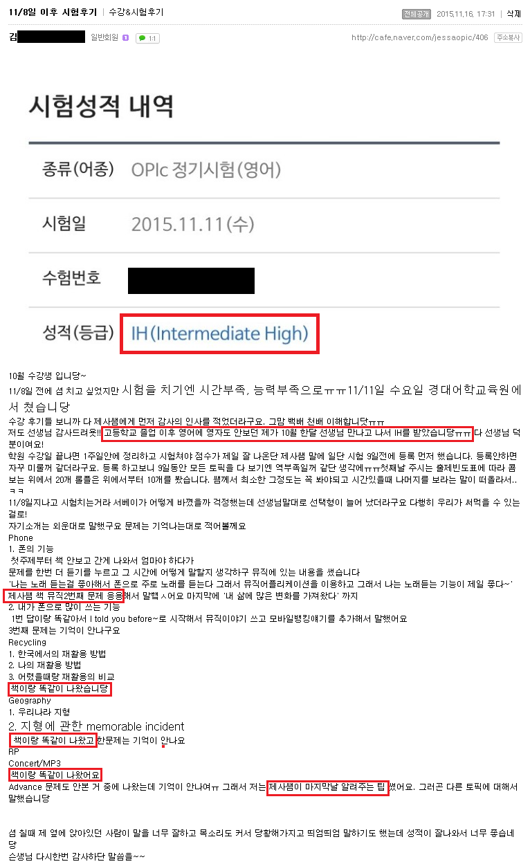 오픽 | (대구오픽 IH후기) 책이랑 똑.같.이 나왔어요~!!★ 오픽 한달 "IH" 획득!! 페이지 정보 작성자 MELPARK 작성일15-11-17 11:05 조회5,002회 댓글0건 이전글 다음글 목록 본문 (클릭 하시면 크게 보실 수 있습니다.) 수강생 후기 입니다. 더 많은 후기는 우측 카페 링크 가입 후 보실 수 있습니다. 이전글 다음글 목록